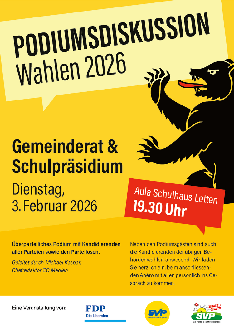 Im Hinblick auf die kommunalen Wahlen vom 8. März 2026 organisieren die Bäretswiler Parteien eine öffentliche Podiumsdiskussion mit den Kandidatinnen und Kandidaten für den Gemeinderat und das Schulpflegepräsidium.